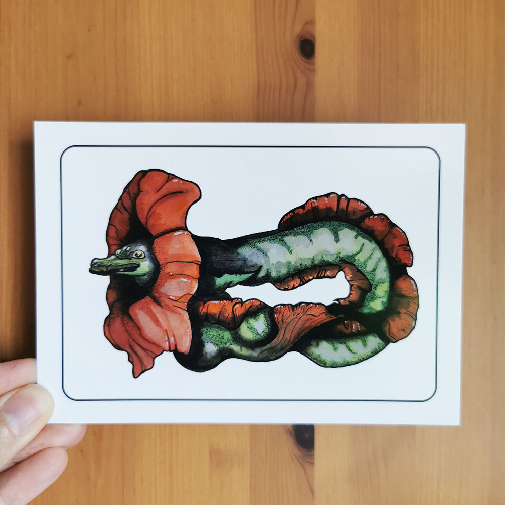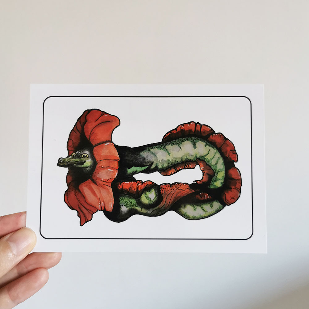 Carte postale A6 issue de la série “Créatures Fantastiques – Inktober 2022”. L’Anguille Coquelicot mêle souplesse abyssale et fragilité florale. Reproduction haute qualité d’une aquarelle originale. Créée à Caluire-et-Cuire.