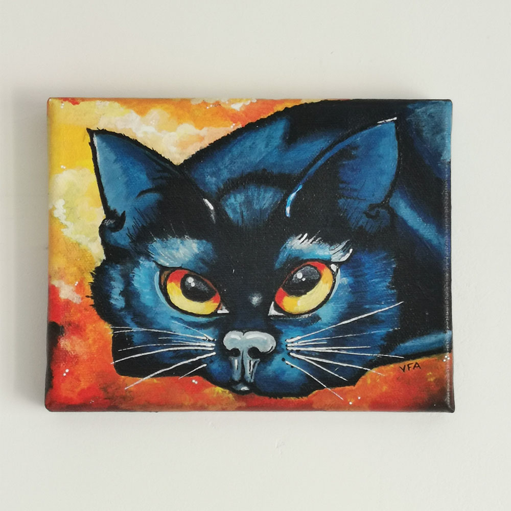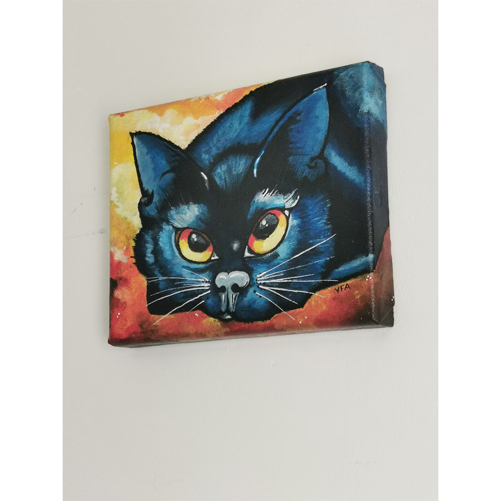 Ce mini-tableau met en scène un chat bleu au regard songeur, un félin à la moue un peu lasse, comme suspendu entre la curiosité et la rêverie.