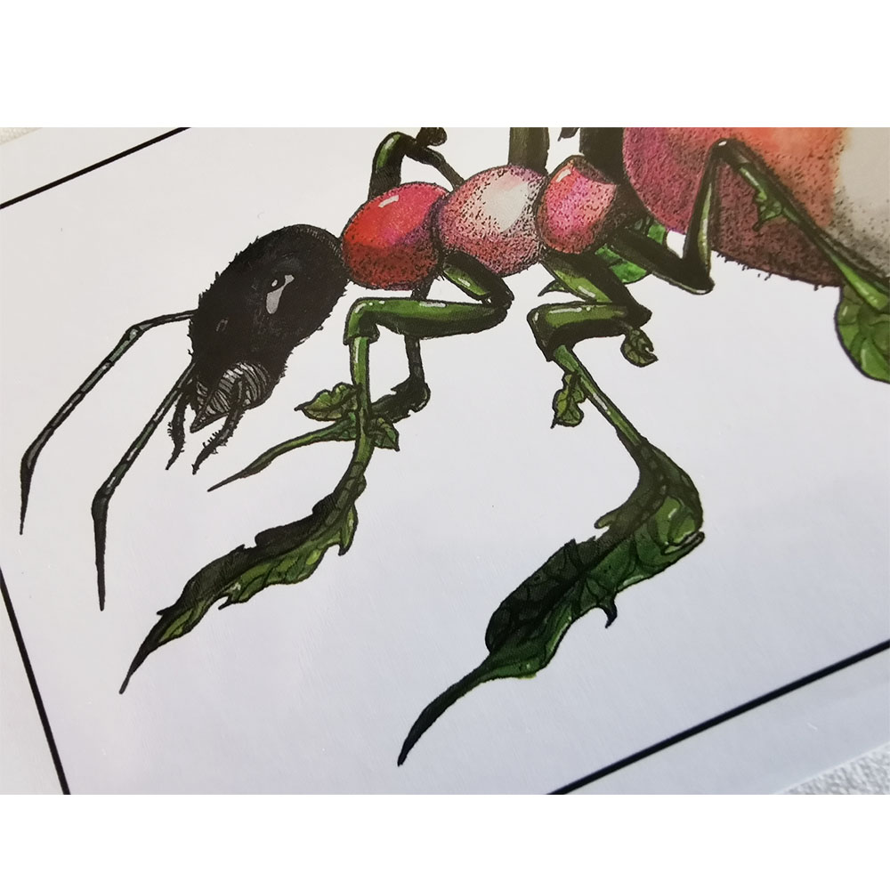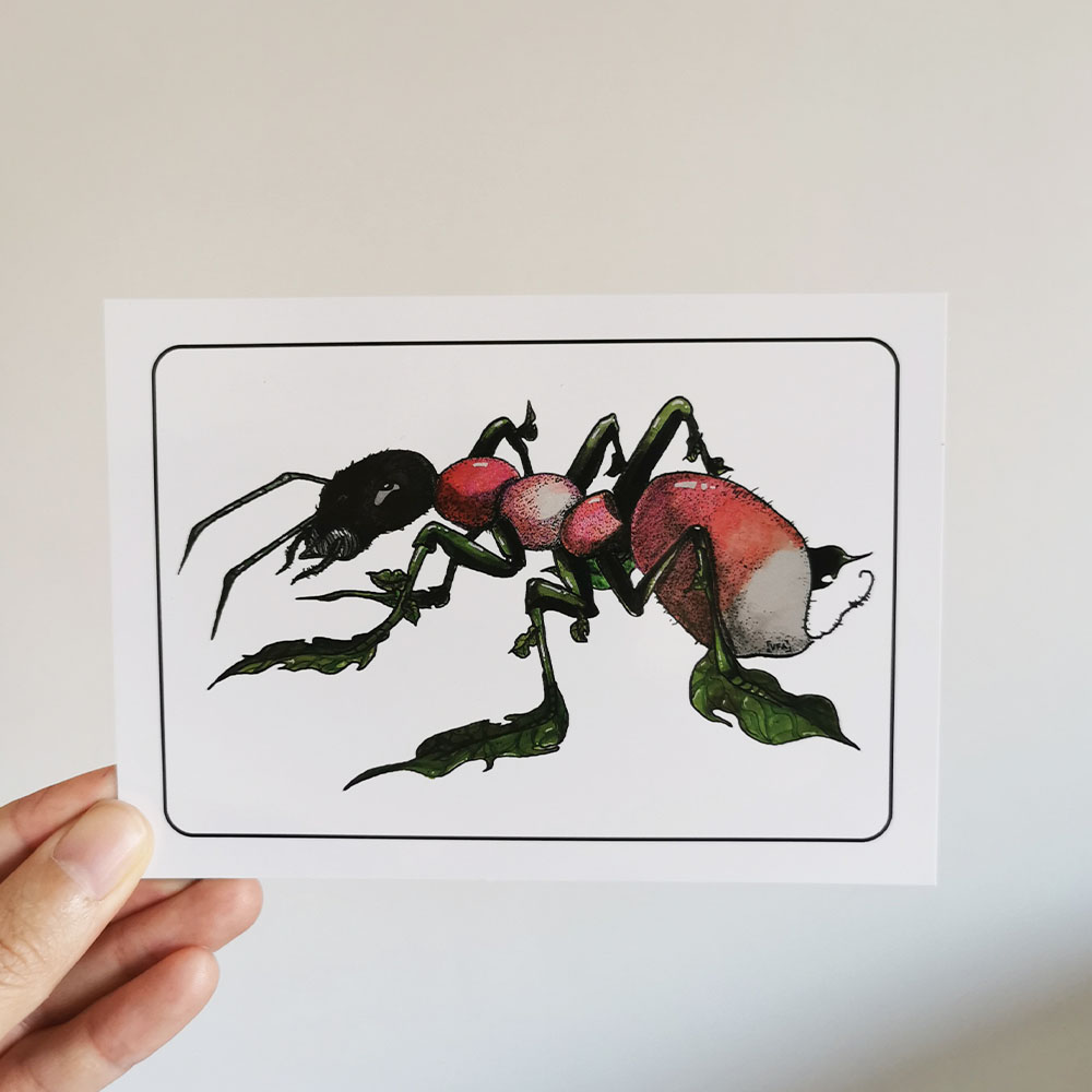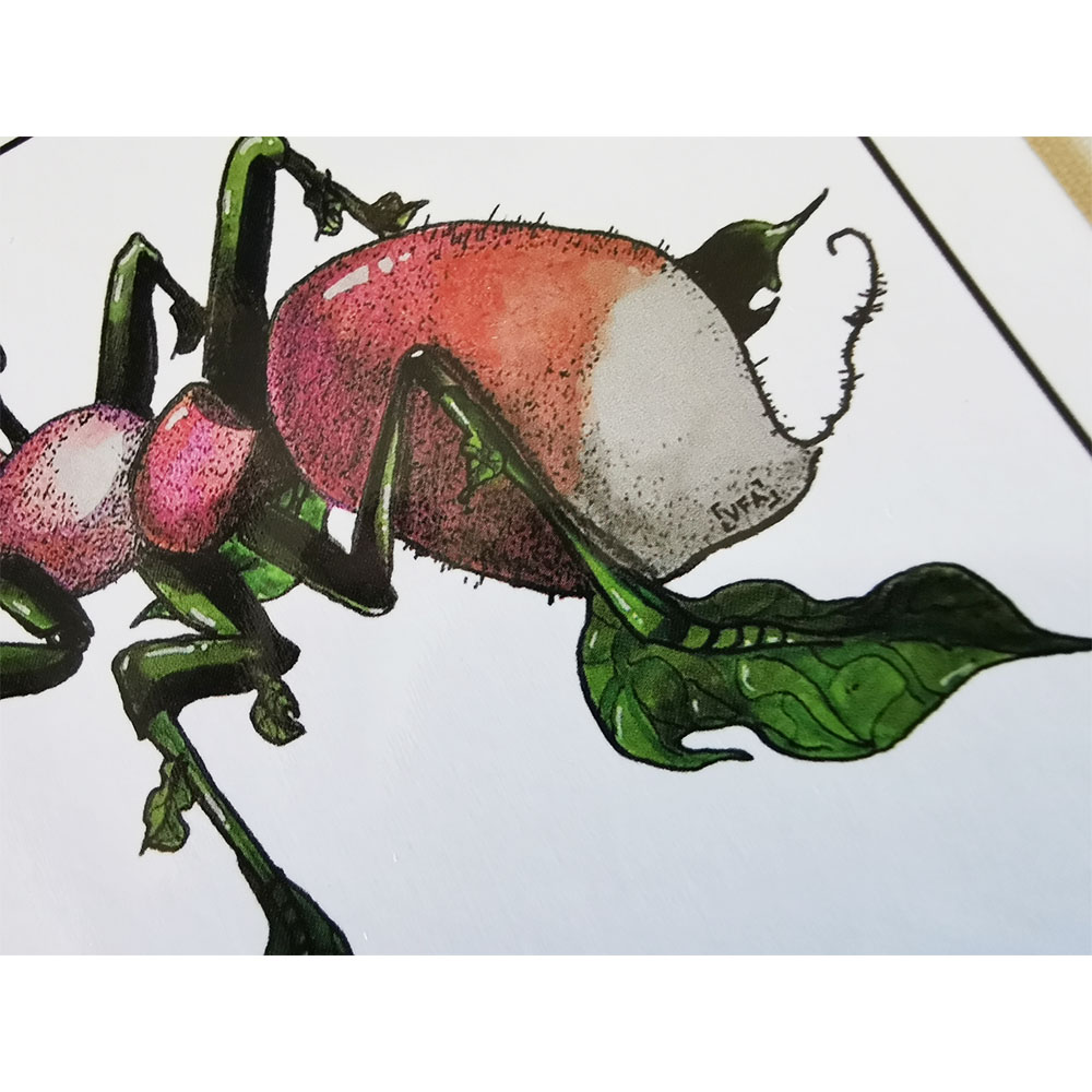 Carte postale A6 issue de la série “Créatures Fantastiques – Inktober 2022”. La Fourmi Radis mêle symbolisme du travail et fraîcheur végétale. Reproduction haute qualité d’une aquarelle originale. Créée à Caluire-et-Cuire.