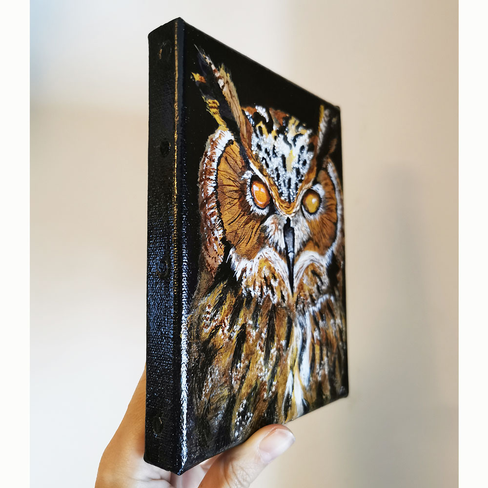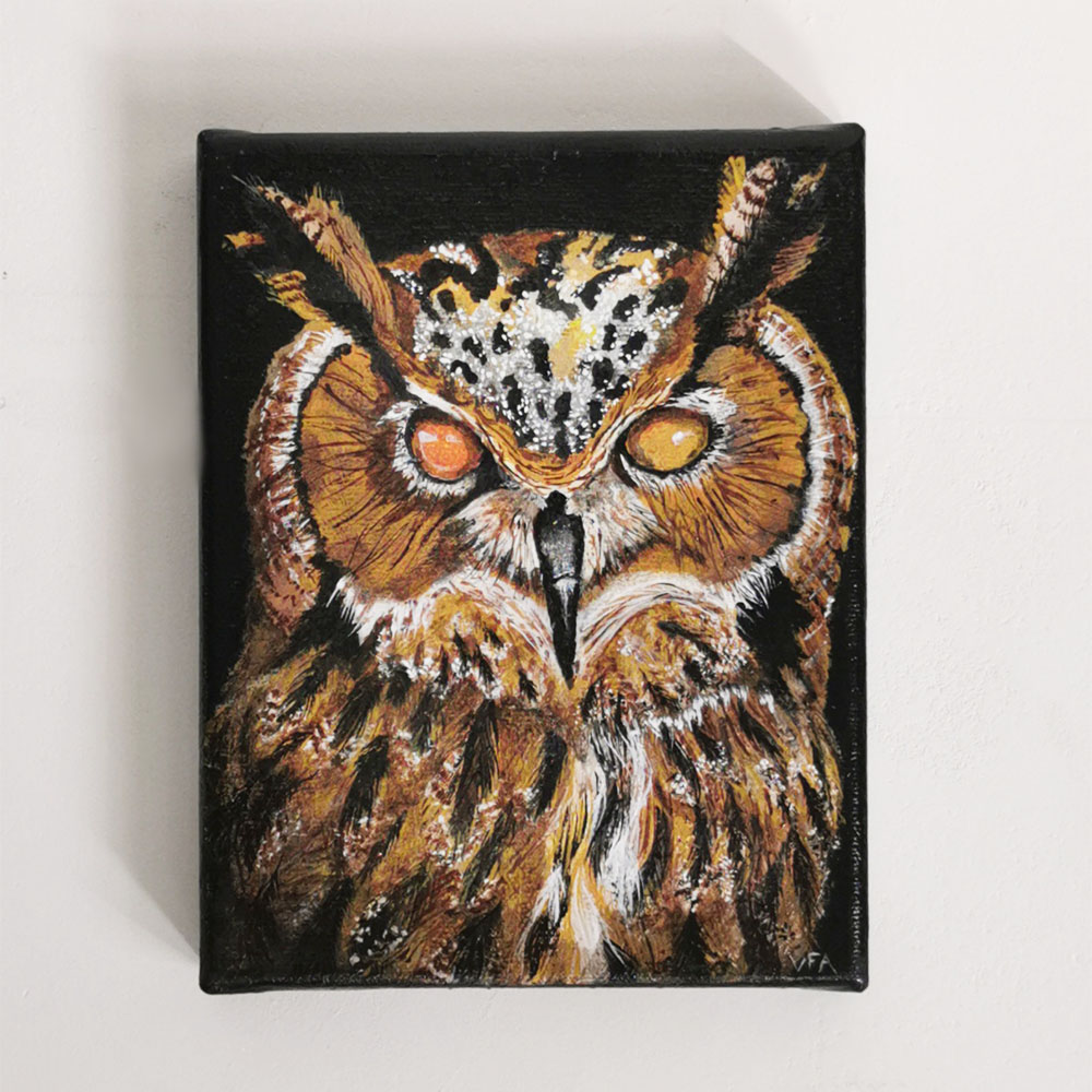 « Le Hibou Duc » est une œuvre unique peinte à la main. Un portrait animalier semi-réaliste mêlant couleurs incandescentes du hibou et fond uniforme noir. Création originale signée Visual for All®. Fabriquée à Caluire-et-Cuire.