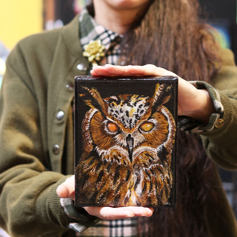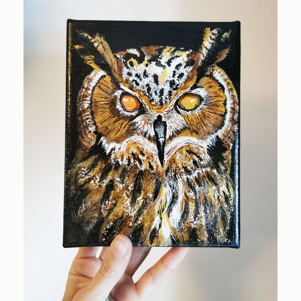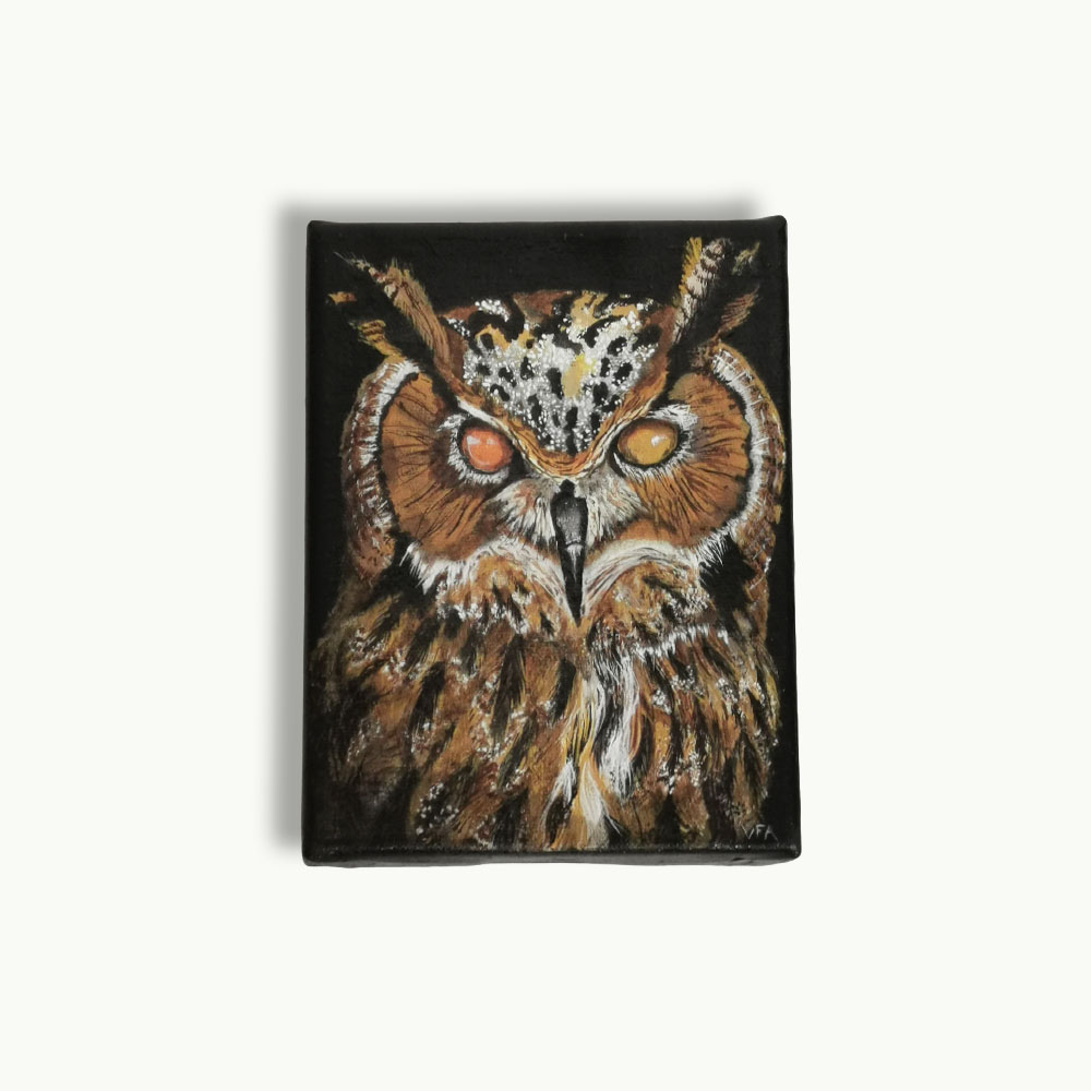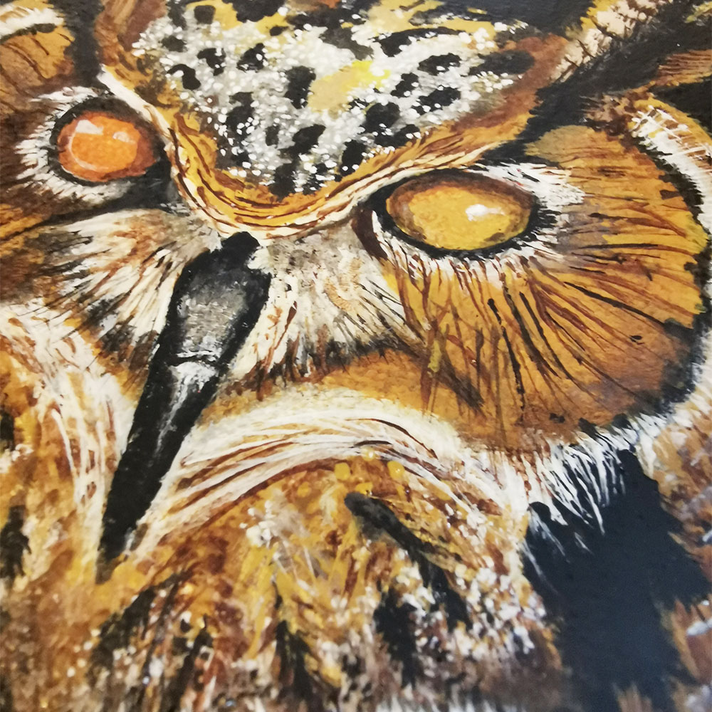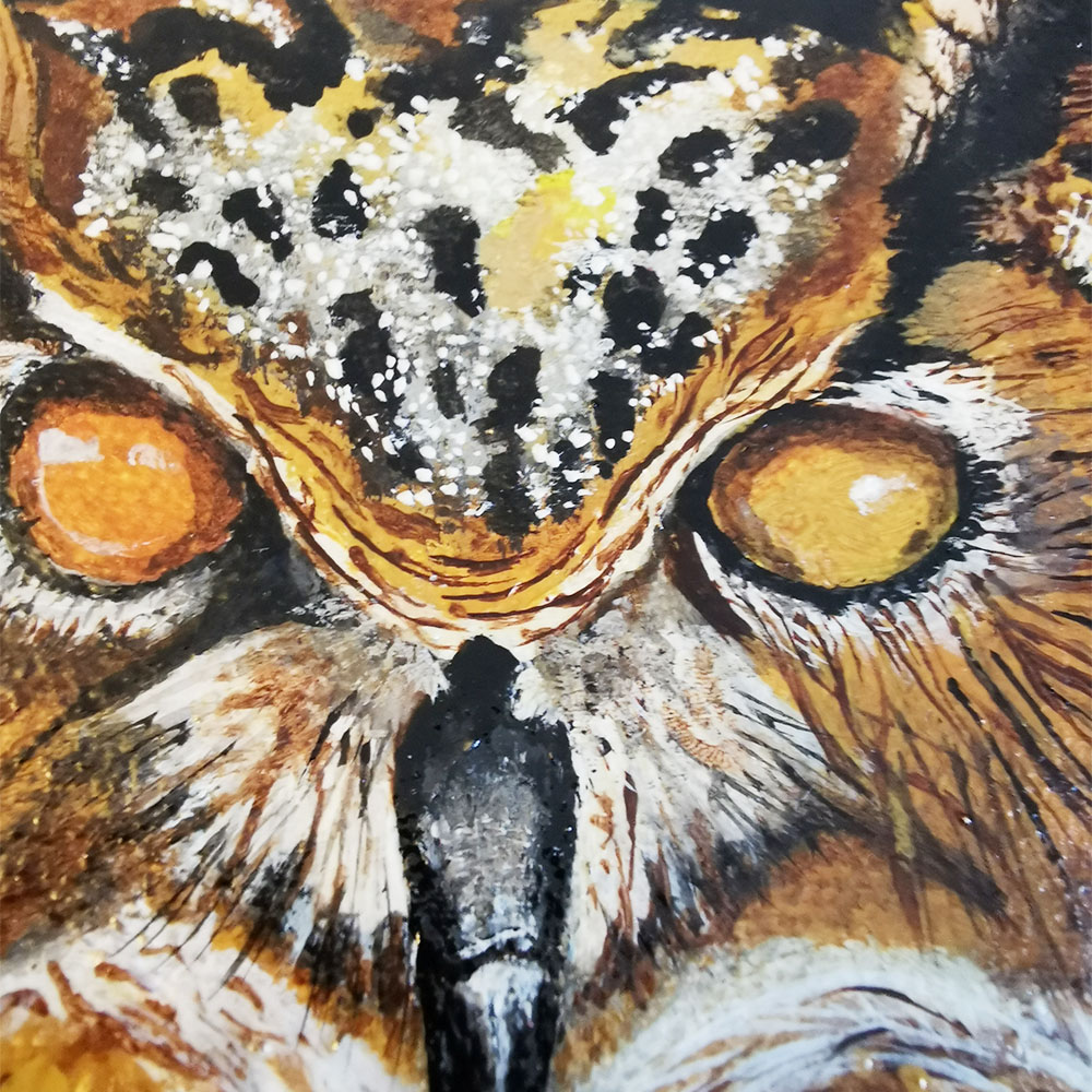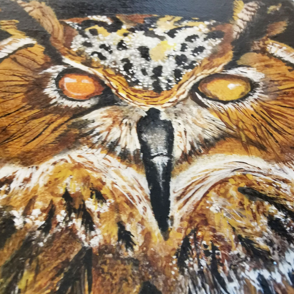 Ce mini-tableau met en scène un hibou duc, « corbeau de nuit » avec son plumage fauve et ses yeux ronds, orange, qui brillent dans la nuit, sont eux aussi très impressionnants.