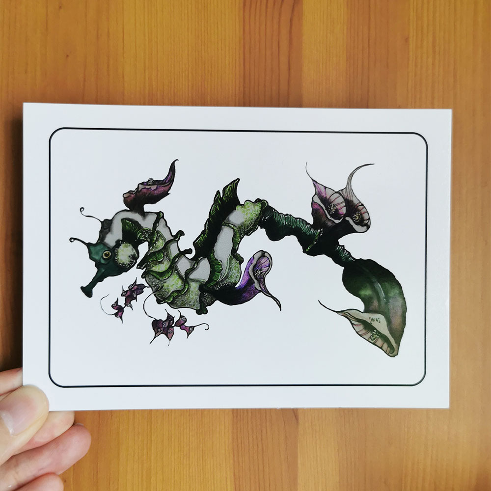 Chaque jour d’octobre, deux papiers tirés au hasard définissaient la combinaison du jour. De là est née l’Hippocampe Arum, aquarellé à la main sur papier Canson 180g/m², avec réhauts à l’encre blanche (Posca) et contours à l’encre Staedtler.