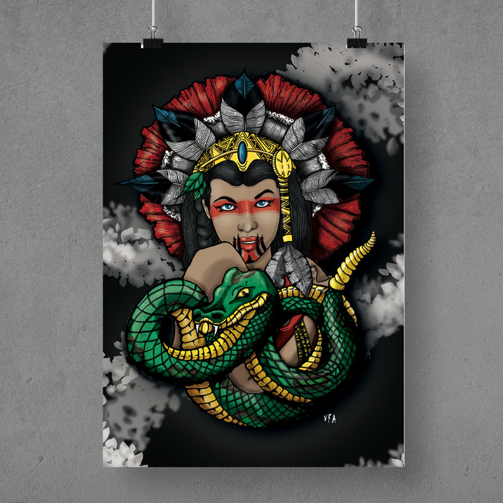 Inspirée de l’univers tattoo, cette illustration digitale met en scène une figure féminine forte et symbolique, accompagnée de son animal totem : le serpent.