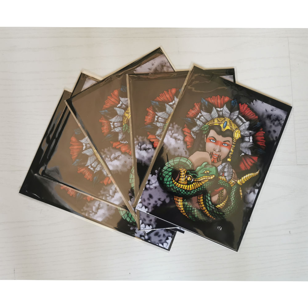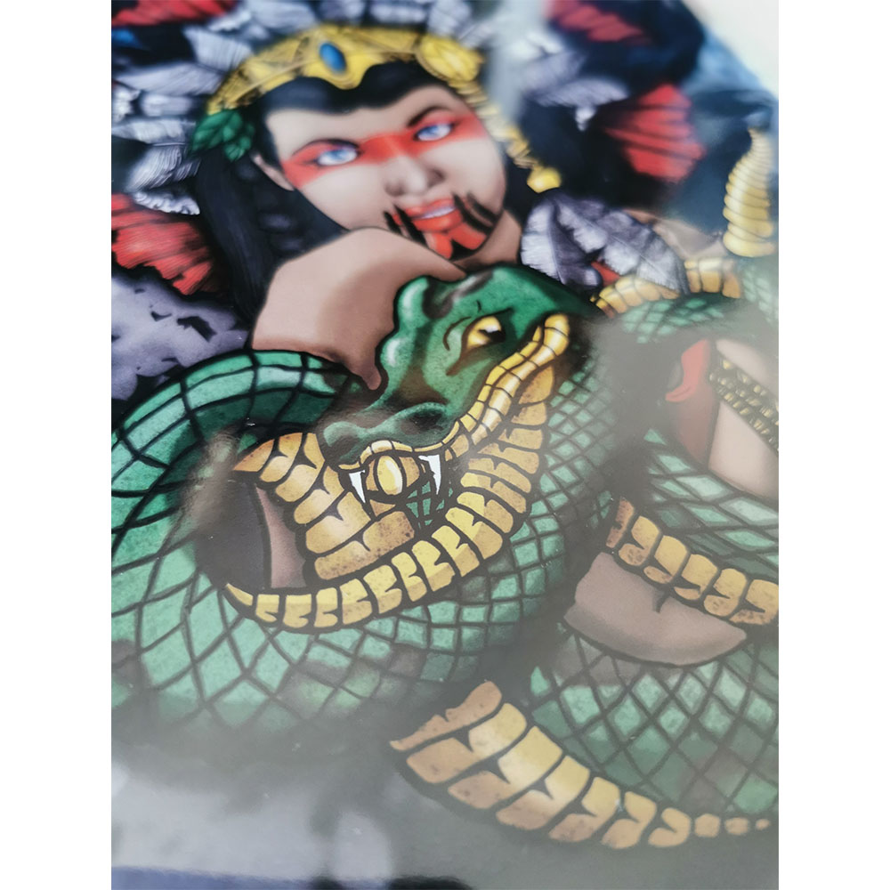 Le fond noir profond fait ressortir les teintes très vives : le vert et le jaune du serpent contrastent intensément avec le teint de l’Indienne et les plumes colorées de sa coiffe. On retrouve des textures riches, mêlant écailles graphiques, plumes dynamiques et détails stylisés dans les traits du visage.