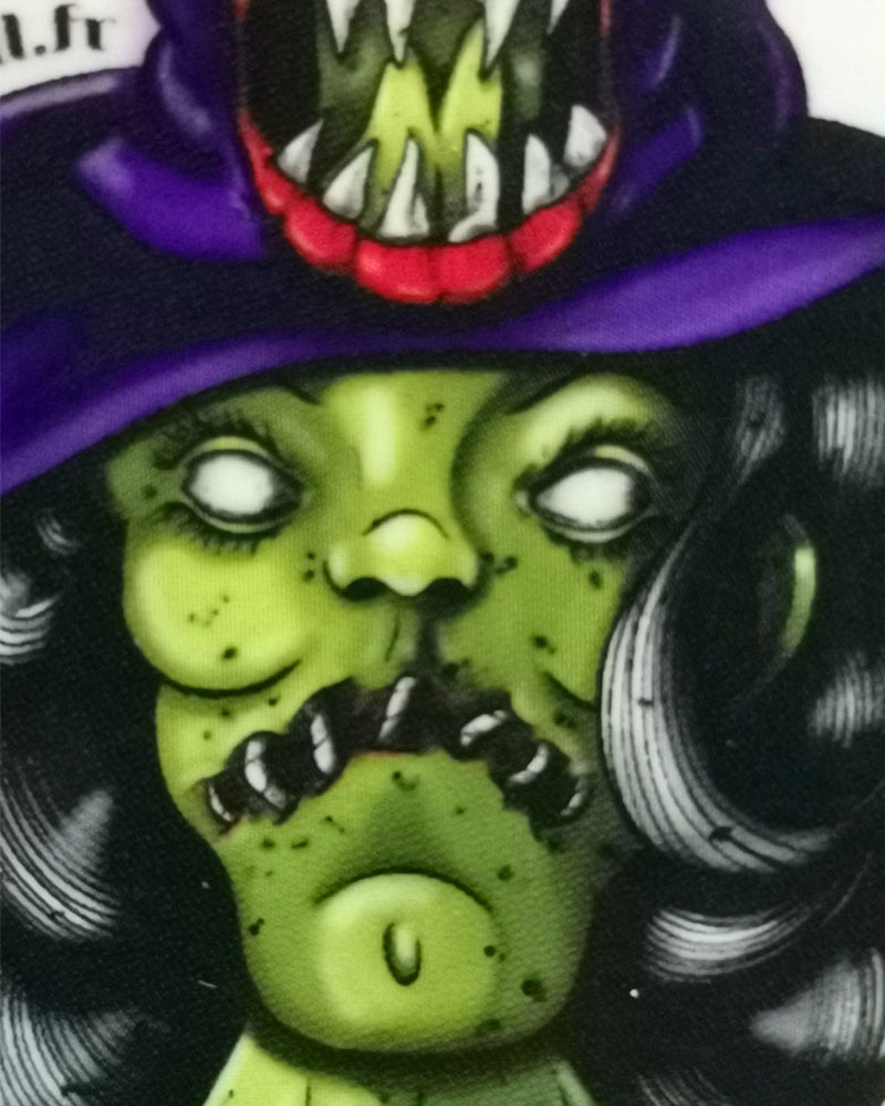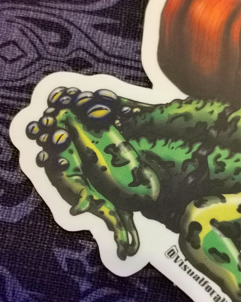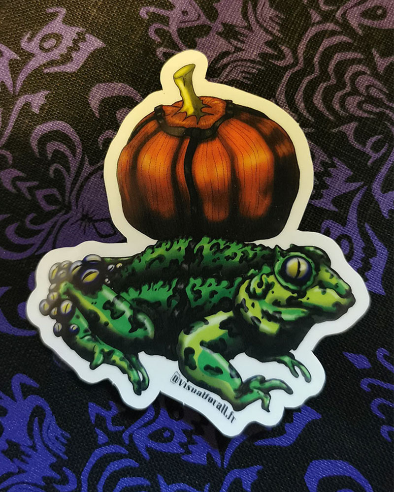 Une grenouille fantastique aux nombreux yeux, portant fièrement une citrouille d’Halloween sur son dos. Dimensions : 64 mm (largeur) × 70 mm (hauteur), finition brillante.