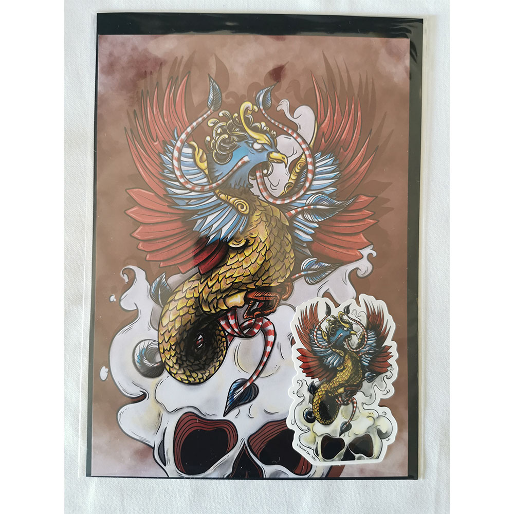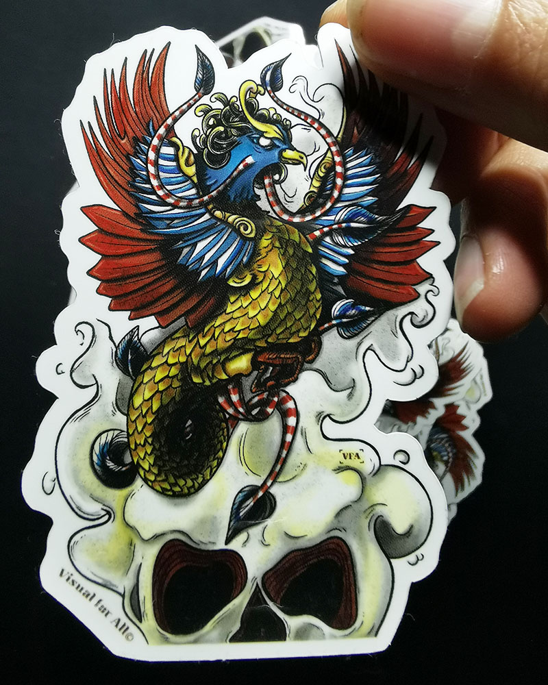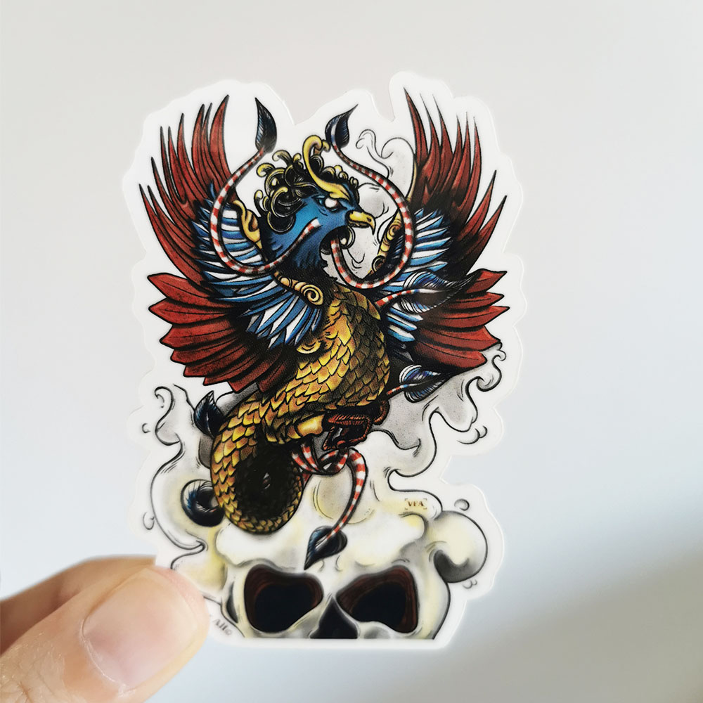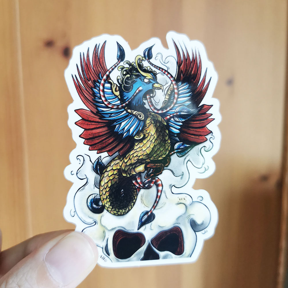 Sticker inspirée du tatouage néo-traditionnel : un phénix majestueux, aux plumes aux reflets métalliques jaunes, bleus et rouges, s’élève d’un crâne blanc en flammes.