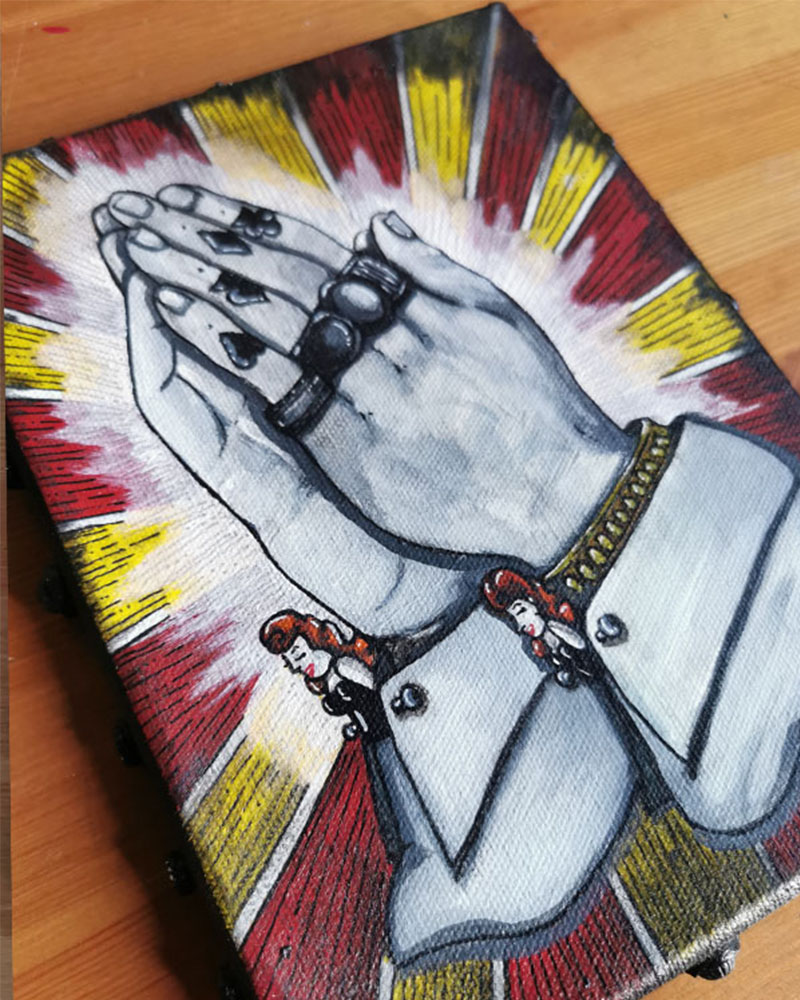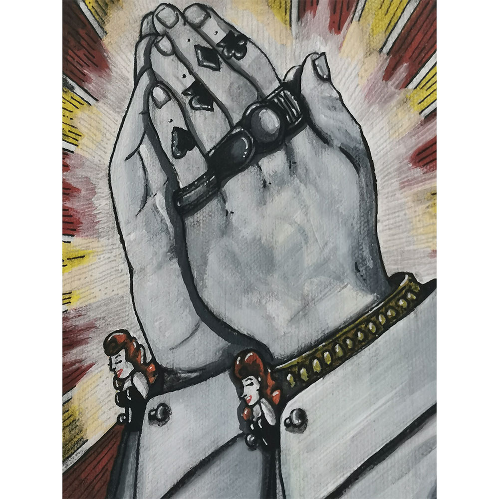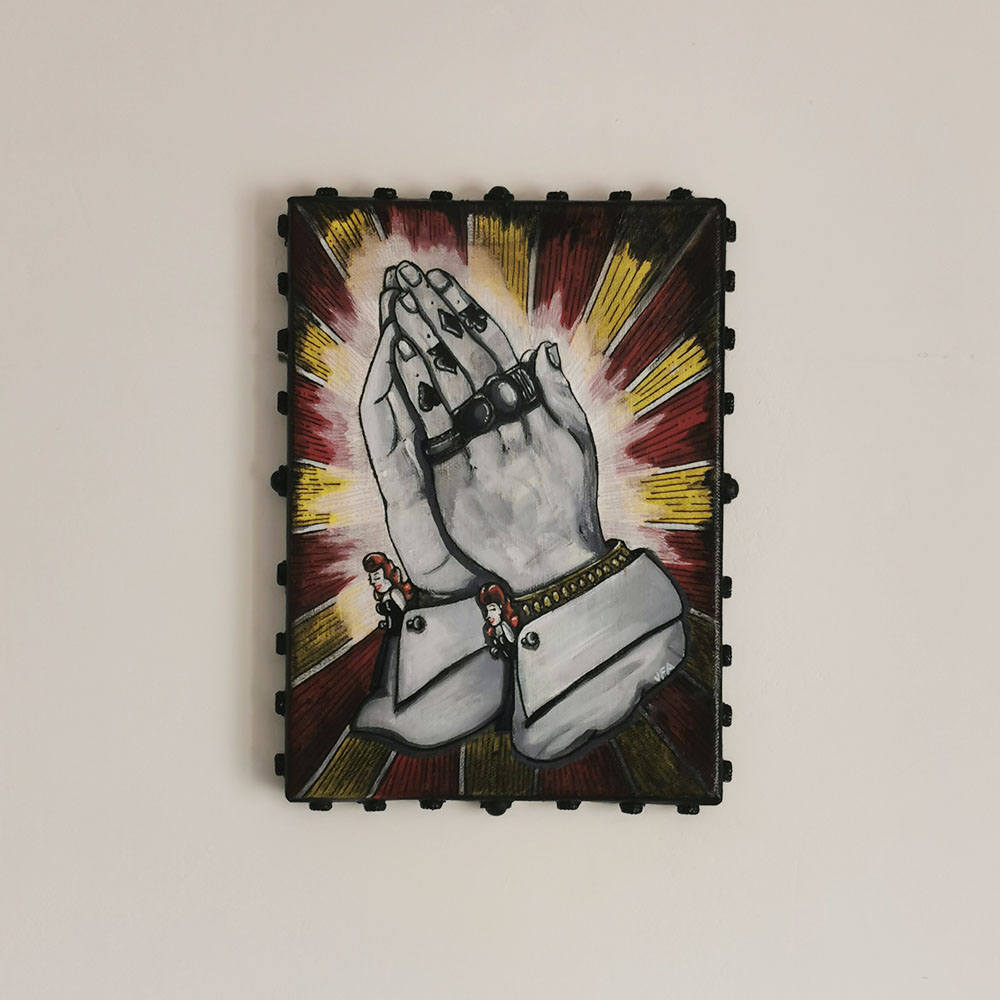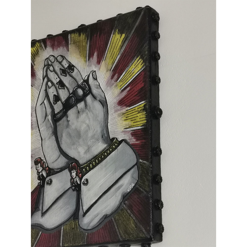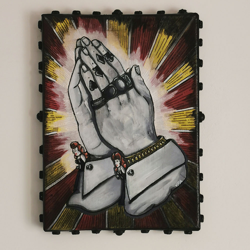 « La Prière » est une œuvre entre spiritualité et culture tattoo. Deux mains masculines tatouées se rejoignent en prière, vêtues de manchettes dont les boutons sont des têtes de pin-up rousses.