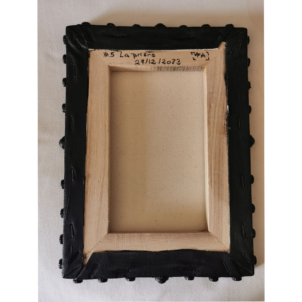 - Les tranches du tableau sont décorées par des cabochons plastique comme incrustations pour créer un effet capitonné ou ornement religieux