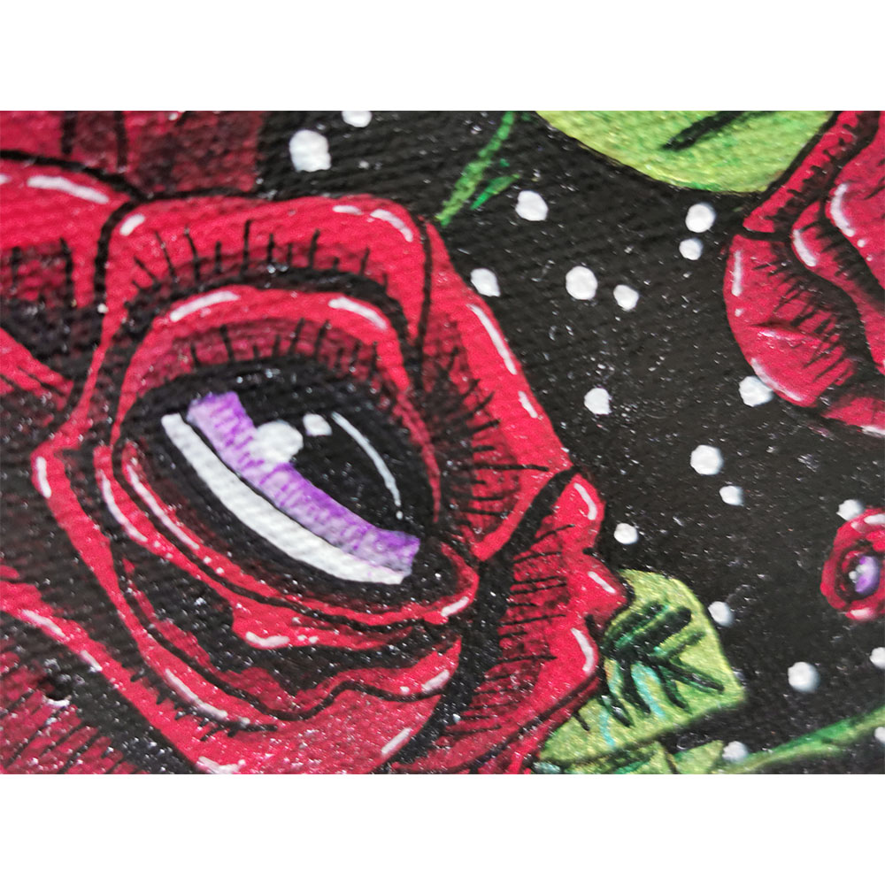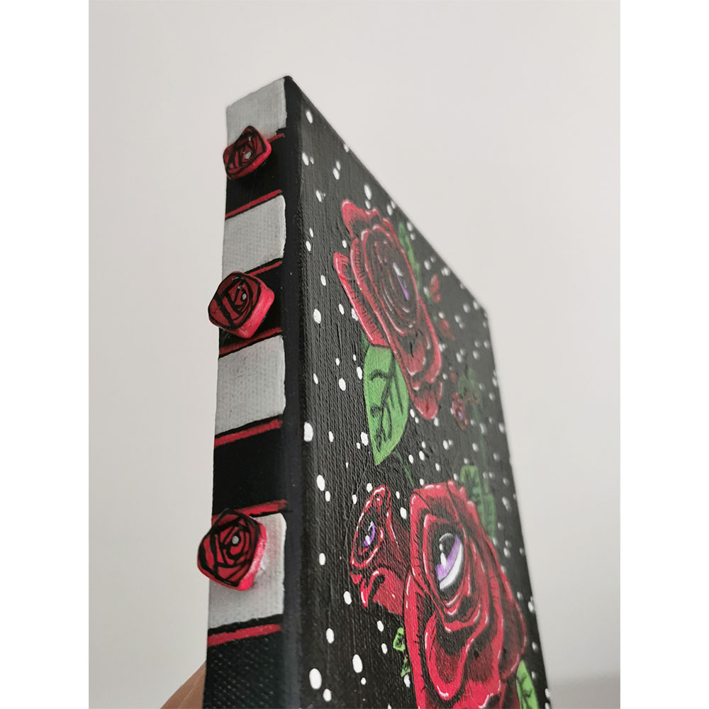 « Les Fleurs du Mal » met en scène des roses fantastiques aux gros yeux expressifs, entre fascination et inquiétude.