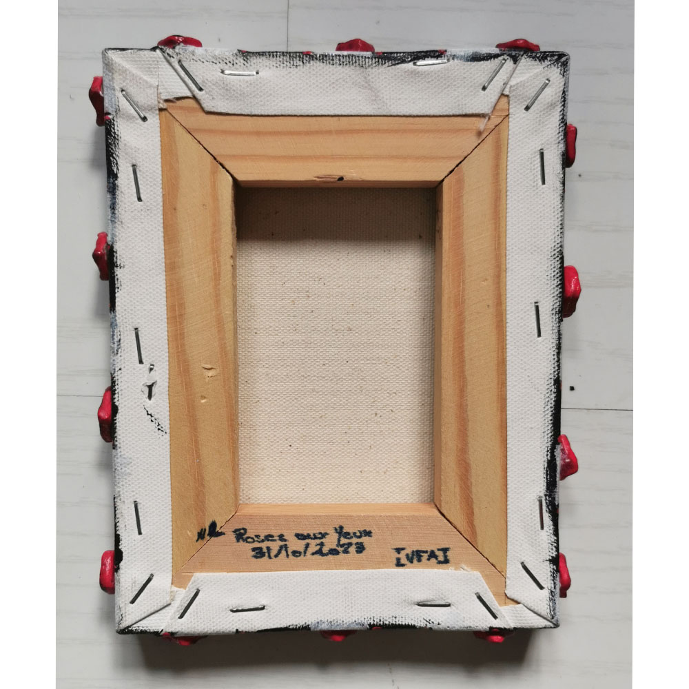 Le contour du tableau, orné de rayures épaisses noires et blanches et d’un liseré rouge vif, crée un cadre graphique à la fois théâtral et hypnotique.