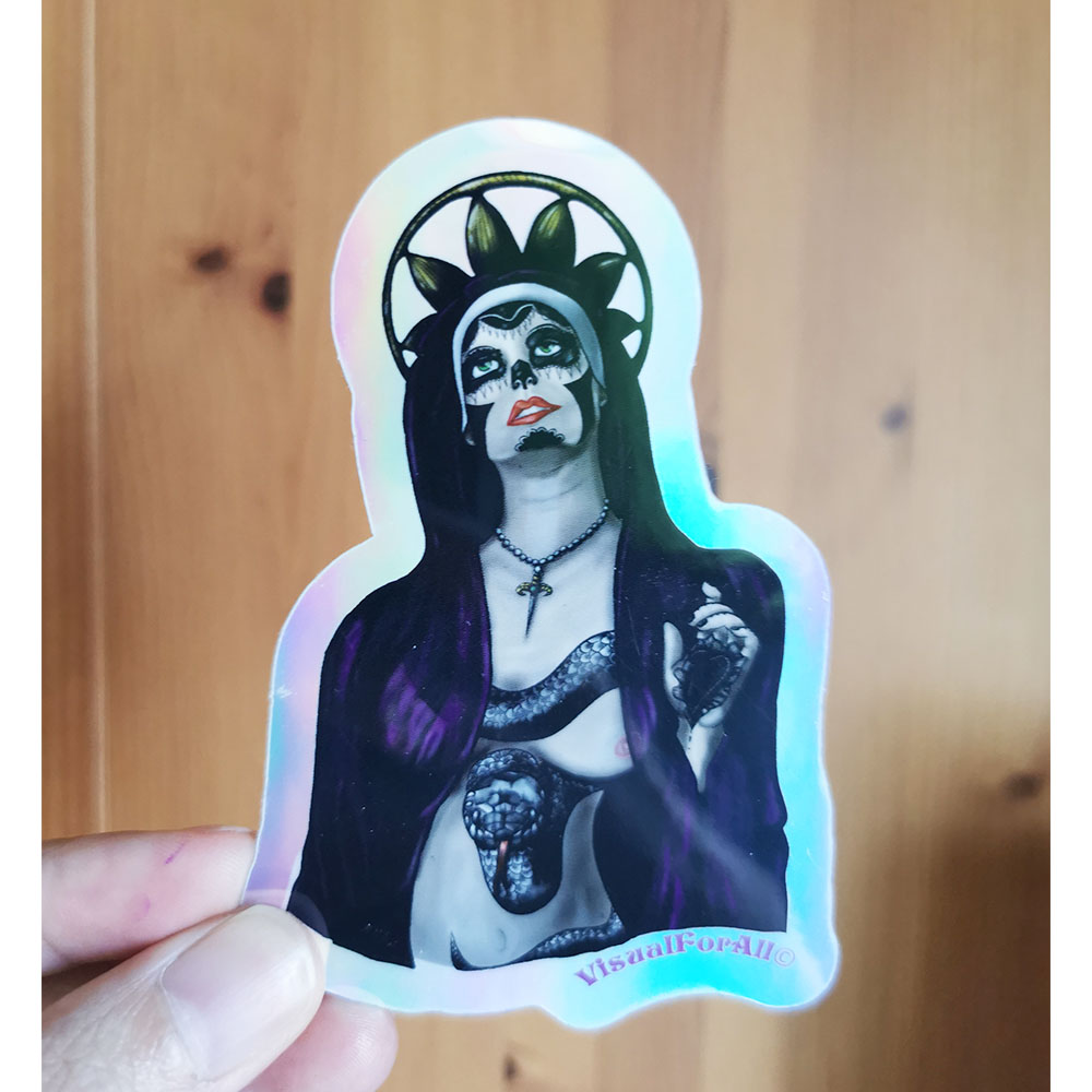 Le fond du sticker est holographique, irisé et brillant : il capte la lumière à chaque mouvement, faisant vibrer le portrait d’éclats changeants. Un effet miroir qui accentue la tension entre sacré et provocation.