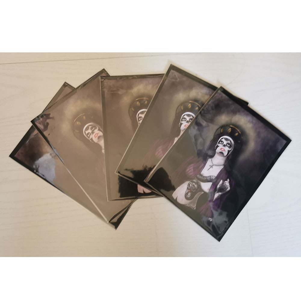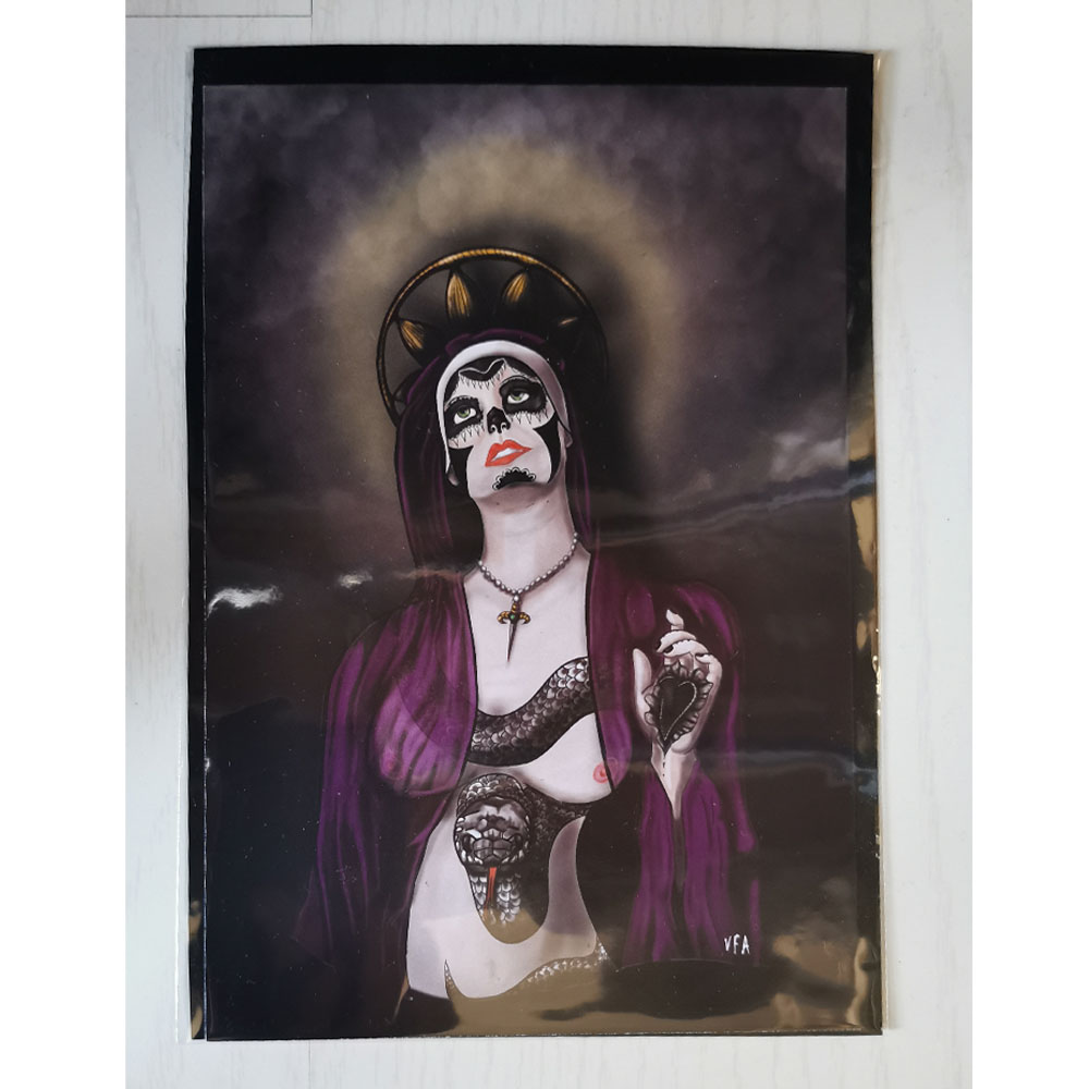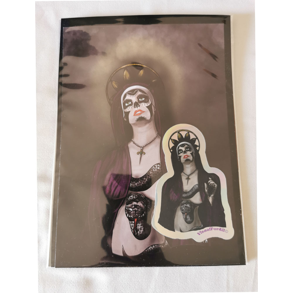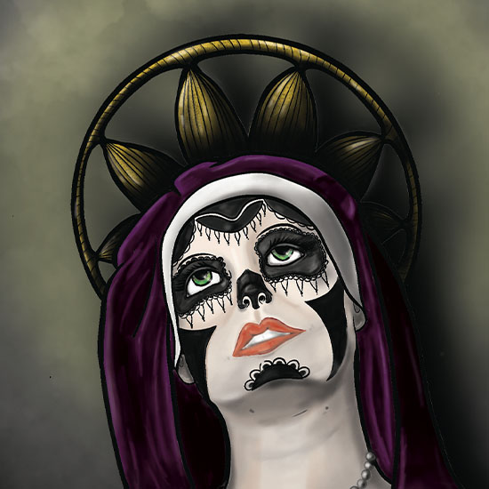 Cette illustration digitale représente une nonne moderne, figure mystique et ambivalente, drapée d’un voile violet profond — couleur du sacré autant que du péché.