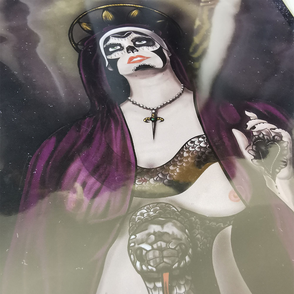 Un serpent ondule le long de son corps à demi dévoilé, incarnation biblique de la tentation. Le contraste entre sa chair nue, ses tatouages noirs et la noblesse du tissu crée une tension visuelle entre foi, désir et transgression.