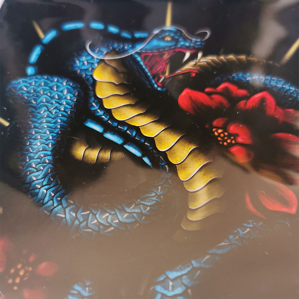 Totem visuel aux allures mythologiques, ce serpent-dragon incarne à la fois la transformation, la protection et l’intensité émotionnelle, dans une composition équilibrée entre horreur sacrée et beauté baroque.